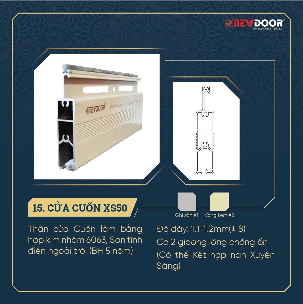 Cửa cuốn khe thoáng – PM - 503 - Kết cấu 2 chân, 2 vít + 3 thanh chữ k chịu lực, Màu vàng kem - Đặc điểm: Móc dày 1.1mm, chân dày 1.15mm – Trọng lượng 10,5 kg/m2 +/- 6%
